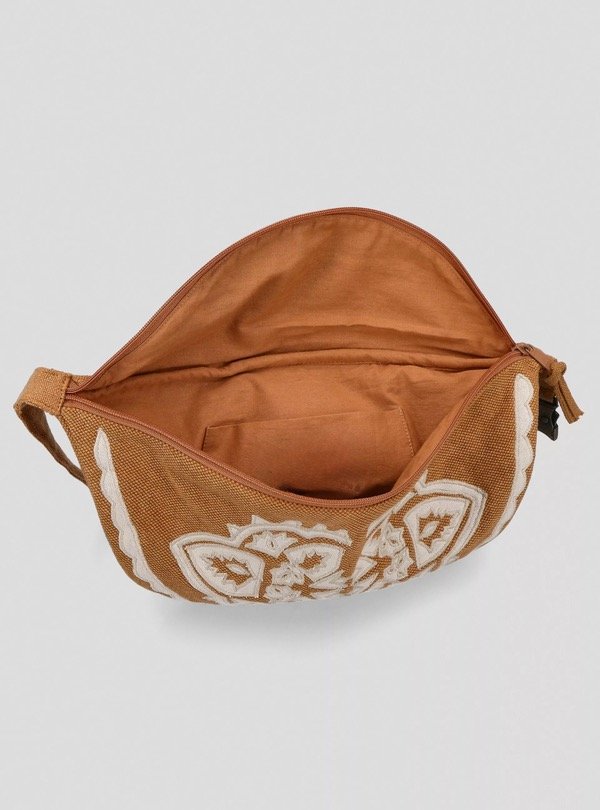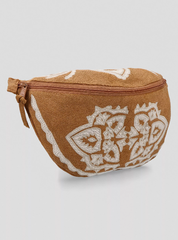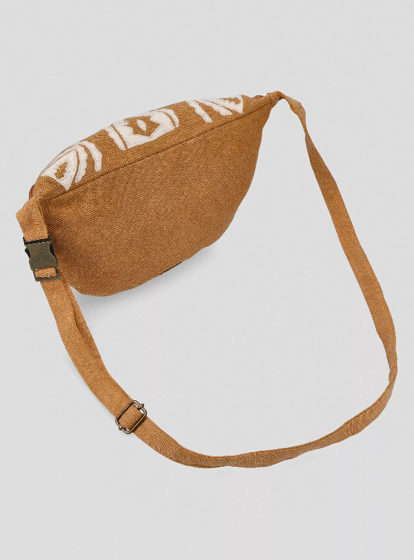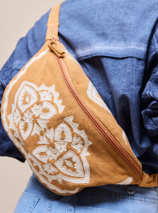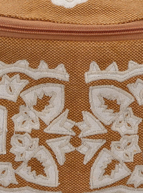 Riñonera naranja de algodón con diseño bordado en blanco y beige.